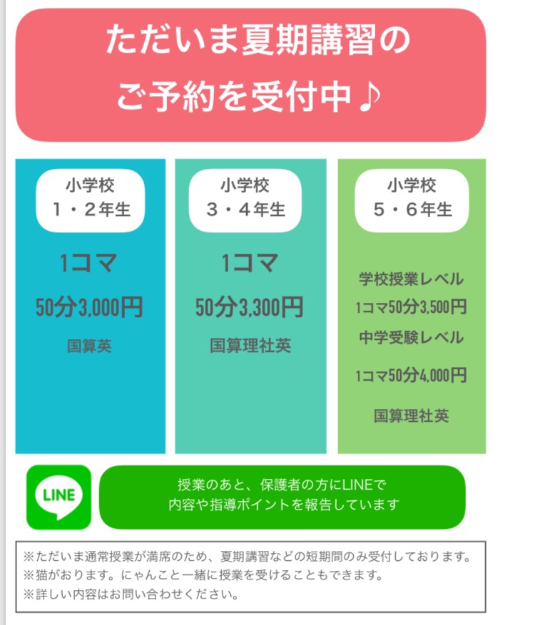 ピーチベースでは夏休みの指導をお受けしています。基本的にマンツーマンの個別指導になっていて、1時間(つまり1コマ)から受け付けています。